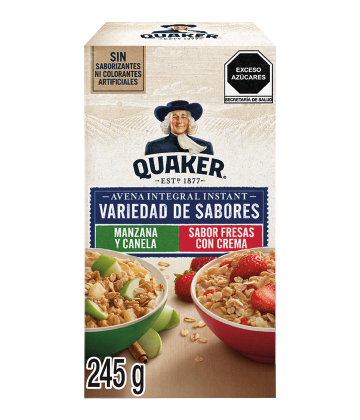 Comienza cada día con la energía de la Avena Instant Quaker®. La avena de grano entero contiene fibra insoluble que contribuye en el proceso digestivo. Puedes disfrutar de Avena Instant Quaker® en tus desayunos preparándola con agua o leche o también puedes incluirla en tus licuados o agregarle tus frutas favoritas. Variedad de Quaker Avena Instant. Sabores Fresas con Crema y Manzana Canela.