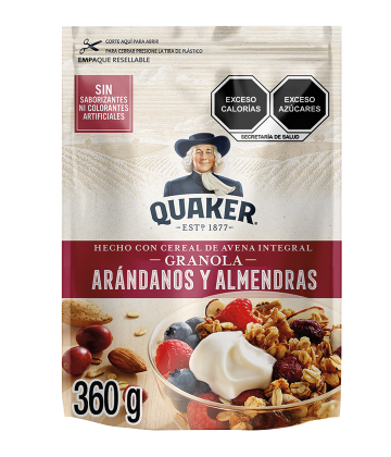 Granola Quaker con Arándanos y Almendras, hecha CON hojuelas de avena y trigo es una opción nutritiva y deliciosa para comenzar el día. Al contener avena de grano entero, proporciona energía para iniciar tu día y fibra que puede ayudar a mejorar el proceso digestivo. Puedes disfrutar de la Granola con Arándanos y Almendras de Quaker® agregándole un poco de yogurt y sirviéndola con tu fruta favorita para completar tú desayuno.